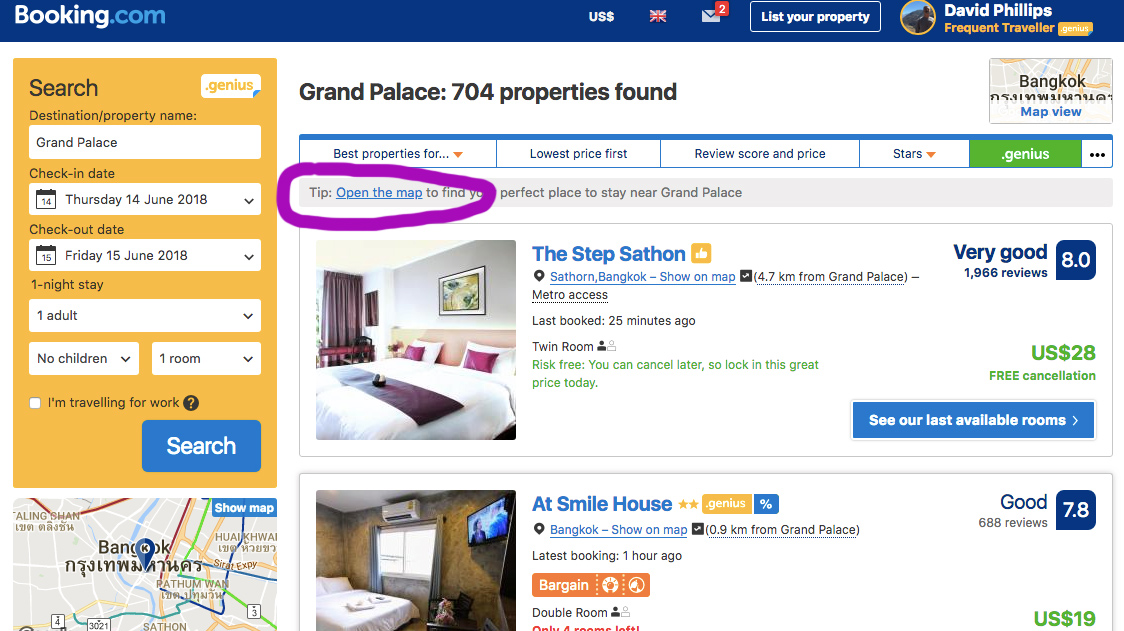 In the next photo you can see the map view that shows up. As you use your cursor to move over the little blue markers, a little box pops up with the name of the hotel, the rating if it has one, and the price for the duration of stay you have selected. I usually type in a duration of one night to start with so I can see the nightly price right away without a calculator. In this case I am hovering on a hotel called Riva Arun Bangkok. What I like about booking.com’s map view is I can see the exact location of the hotel on the map, as well as the name, rating and price of the hotel all at one time. (Enlarged here for your easy viewing) This is convenient. Depending on my priorities at the time, I can make my initial choices all in one place.